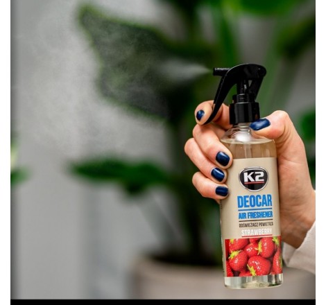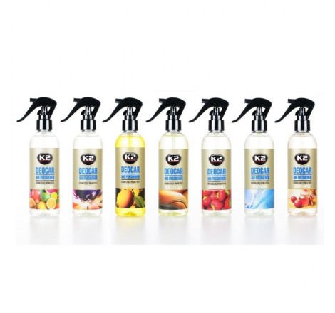 Odświeżacz powietrza z atomizerem K2 Deocar jest wyjątkowo wydajny. Dzięki zastosowaniu nowoczesnego aplikatora odświeżacz zrasza otoczenie delikatną mgiełką, która skutecznie wypełnia cudownym aromatem całą przestrzeń. Butelka 250ml wystarcza na ponad 700 aplikacji. Szczegółowo wyselekcjonowane, intensywne kompozycje zapewniają długotrwałe utrzymanie się zapachu w pomieszczeniu.