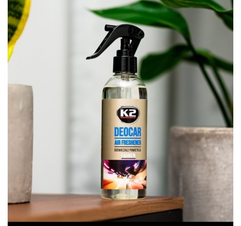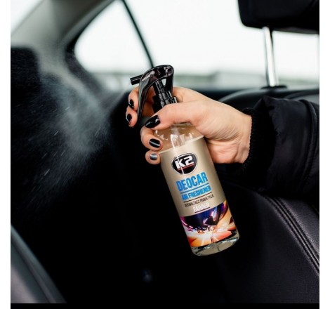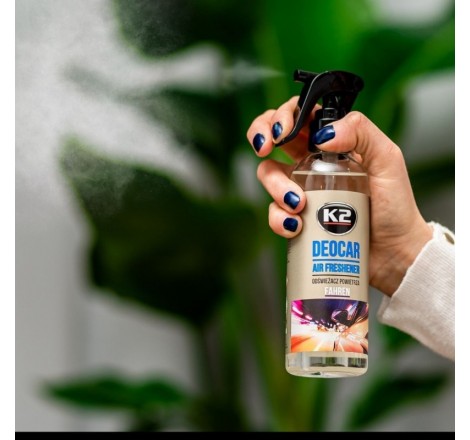 Odświeżacz powietrza z atomizerem K2 Deocar jest wyjątkowo wydajny. Dzięki zastosowaniu nowoczesnego aplikatora odświeżacz zrasza otoczenie delikatną mgiełką, która skutecznie wypełnia cudownym aromatem całą przestrzeń. Butelka 250ml wystarcza na ponad 700 aplikacji. Szczegółowo wyselekcjonowane, intensywne kompozycje zapewniają długotrwałe utrzymanie się zapachu w pomieszczeniu.